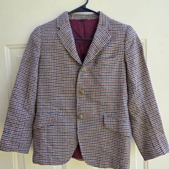 mens xxs womens xs with a timeless houndstooth pattern. This sophisticated sport coat features a three-button closure, lending a refined silhouette and allowing for versatile styling. Details include a notched lapel, adding a touch of traditional tailoring, as well as flap pockets at the hips and a welt pocket at the chest. The interior is fully lined in a rich burgundy fabric with a subtle repeating pattern, providing comfort and adding a luxurious touch. The jacket is well-constructed, ensuring durability and a flattering fit.