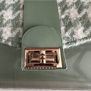This elegant handbag and pouch set features a timeless houndstooth pattern in a sophisticated green and white color palette. The clear accents on the handbag add a modern touch, making it a versatile accessory for various occasions. A secure clasp ensures your belongings are safe, while the matching pouch provides convenient storage.