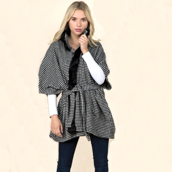 Houndstooth jacket checks all the boxes! Stylish and warm, this striking black and what jacket will take you through fall and winter. The belted waist is flattering and a faux fur collar adds flair!