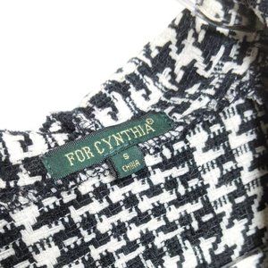 Button front peacoat jacket in a flared, swingy shape and finished with fringed hem. Black and white knit, houndstooth pattern. Metal tipped drawstring hood, slightly cropped sleeves and front pockets.