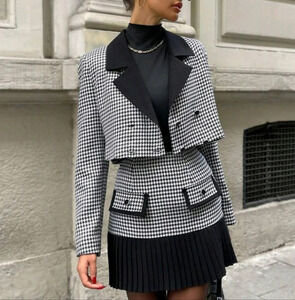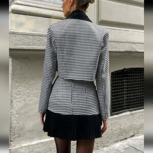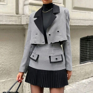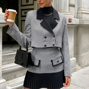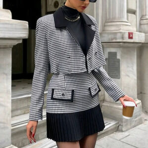 Houndstooth Pattern Suit & Pleated Skirt Hem Outfit