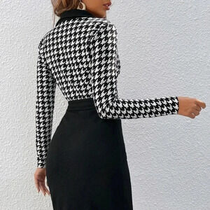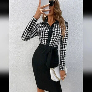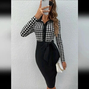 Houndstooth Print Belted Bodycon Dress