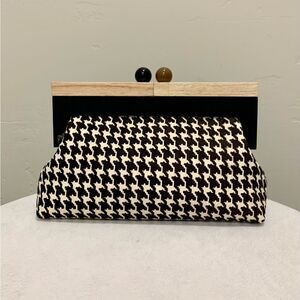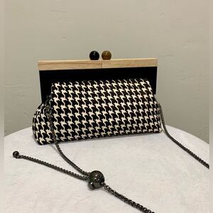 It's classy clutch, handmade from hair-on-horsehide leather. Classic black and white houndstooth print pattern, with chic wooden frame. Includes a chic, adjustable chain, use in multiple ways, hand carry, wear as a shoulder bag or crossbody.