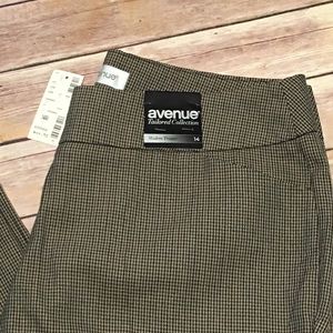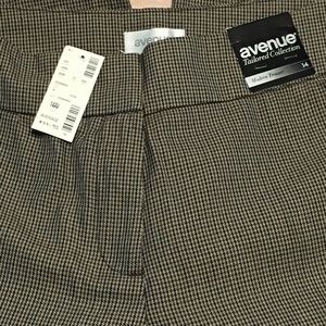 Perfect for business casual! Houndstooth patterned pants in multiple shades of brown with hints of blue. Average length from Avenue's Tailored Collection. Front zipper with hook and eye closure. Two front pockets.