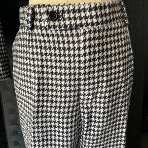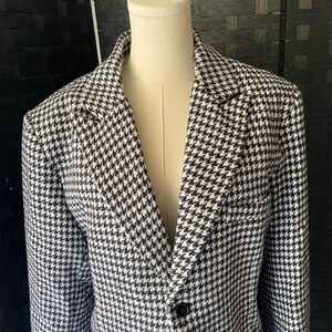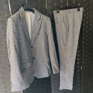Houndstooth black & white men’s 2 pc suit. No label. Unknown designer, but brand new soft cotton/poly blend and lined 2 button blazer measuring large or 42 regular. Matching flat front, 2 pocket, zip front pant measuring 36 inch waist and a 30 inseam
