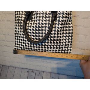 Houndstooth patterned PVC material that is easy to keep nice and clean. Rolled handle and adjustable long strap shoulder purse. Decorative padlock hardware on the front. Medium to large in size. See pictures for measurements. In excellent pre-owned condition. Colors are black and white with golden hardware. Has a versatile look for many different types of occasions, but also functional and spacious for day to day use.