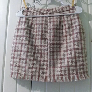Like new-no signs of wear. Maybe worn once. Size large-flat waist 14" and centerback length is 17". The waist seems small and more like a medium compared to lots of larges that I measure. Please verify your waist measurement. :) Mauve and white houndstooth tweed mini skirt. No defects. Brand is HYFVE. Price firm.