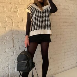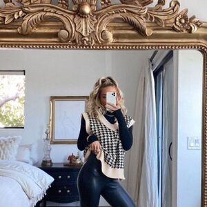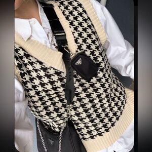 Black and white houndstooth printed sleeveless v neck sweater