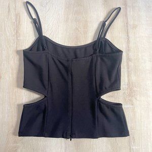 Cropped tank top with side cutouts and zipper in the back. It also has adjustable straps and is made of Ponte jersey fabric.
