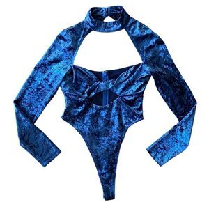 H:ours Daria Blue Crushed Velvet Twist Bust Long Sleeve Bodysuit NWT Size Small