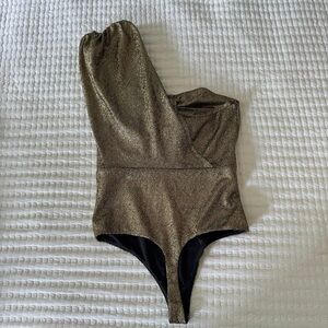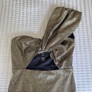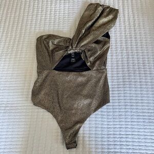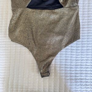 Self: 95% poly, 5% elastane.Lining: 100% poly. Hand wash cold. Bottom snap button closure. Bodice cut-out. Metallic foil print throughout. Imported. Made in ChinaRevolve Style No. HURR-WS312. Manufacturer Style No. HOS202 H19.