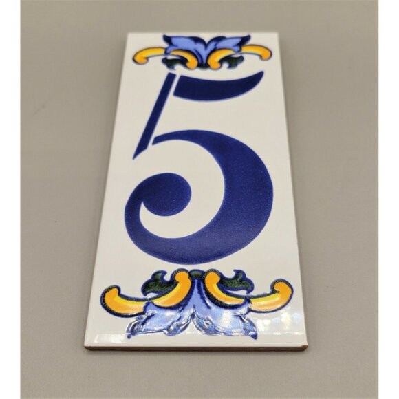 House Number Tile Number 5 Glazed Clay Pottery Blue and White