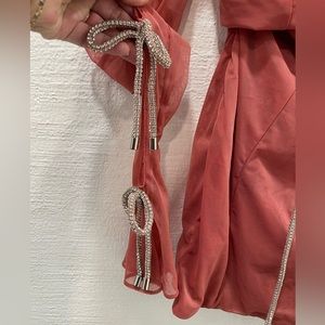 Condition is new with tags. 'Miranda' is cut from a double layer of soft stretch mesh that hugs your curves beautifully. 'Miranda' has super sexy cutouts and features a crystal rope trim to the high neckline and strategically placed bows to the sheer sleeves and flared cuffs for a super fun finish. The crystal tie can be worn as a halter strap or tied round the body. It has a zip to the back for easy on and is suitable for any bust size as it has no cups. Dress length approximately 86 cm.