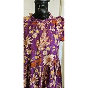 The House of Harlow 1960 dress in size Large features a stunning purple floral pattern with ruffle accents and flutter sleeves, making it a perfect choice for weddings, parties, or casual occasions. Made from 100% cotton knit fabric, this short-length dress has a crew neckline and a pullover closure for easy wear. The classic style and beautiful design make it a versatile option for any season, whether it's winter, summer, fall, or spring. Perfect for women looking to make a stylish statement with a feminine and unique outfit.