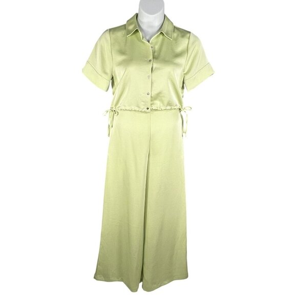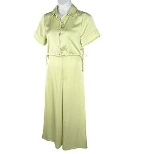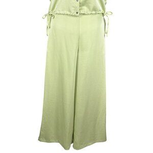 A blend of elegance and ease, this lime green ensemble offers a timeless cropped top with drawstring accents and flowing wide-leg pants. Lightweight and airy, it's fashioned for those seeking a mix of comfort and modern style. The set’s pastel hue whispers freshness, making it a stunning addition to versatile wardrobes.