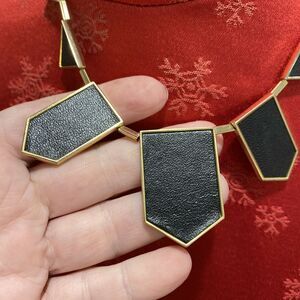 Vintage House Of Harlow 1960 Necklace - the Station Triangle Necklace done in gold tone with textured black leather look finish. This is a statement necklace - eye-catching and dramatic. It is about 18" long - the large pendant at the front is about 1.5" long. There is wear on the gold finish backing - but the front of the necklace looks great with no damage or flaws. Overall excellent vintage condition - ready to wear!