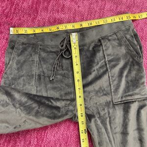 House of Harlow Joggers Pull on Elastic waist with drawstring tie Two front hand pockets Straight leg tapered at bottom Ankle length Soft stretch velour/velvet fabric 95% polyester 5% spandex Gray Size Medium Waist: 15 Rise: 10 Inseam: 28 Measurements are approximate and taken laying flat. Very good used condition.