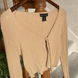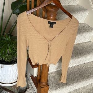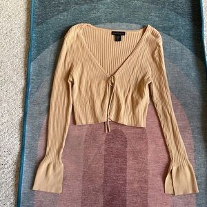 Stylish tan ribbed knit sweater with a tie front. Perfect for casual wear. very 90s y2k, slit bell sleeves great little layering piece, size medium, great pre loved condition