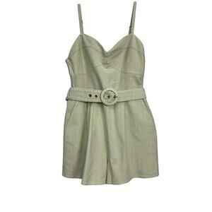 House Of Harlow 1960 x Revolve 'Nicola' Green Linen Romper Size M: hidden back zipper closure, adjustable shoulder straps, side slant pockets and detachable waist belt, lightweight woven fabric.