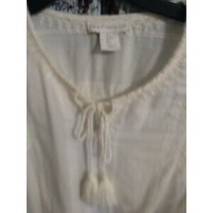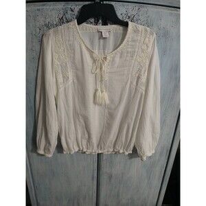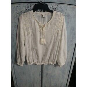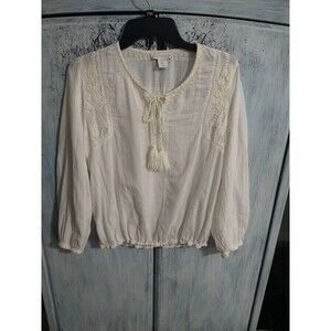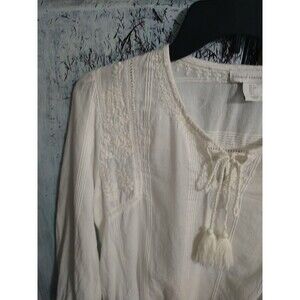 The House of Harlow Embroidered Tassel Top in small size is a boho, cottage core, beachy piece perfect for various occasions such as travel, weddings, parties, casual outings, workwear, and business meetings. This ivory blouse features long sleeves and a pullover closure, making it easy to wear. The embroidered accents add a touch of elegance to this colorful, versatile top suitable for all seasons. Made by the popular brand House of Harlow, this top is a stylish and versatile addition to any woman's wardrobe.