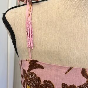 Elegant pink dress with brown floral patterns, perfect for any occasion. Linen.
