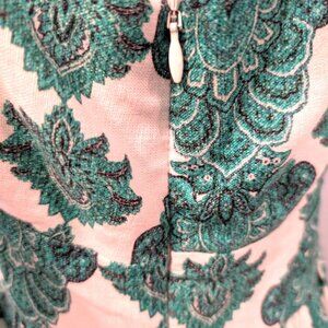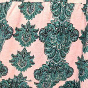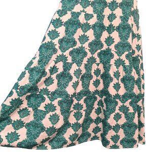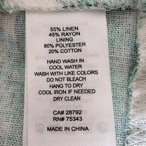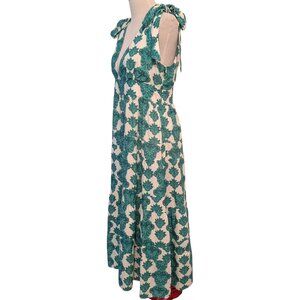 Good condition, minor signs of wear, no rips, holes or tears, pretty green/ivory print, deep v-neckline, tie straps, tiered ruffles, maxi length, linen/rayon blend