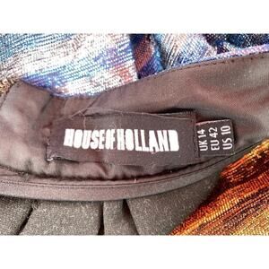 Gorgeous House of Holland's 'Tequila' skirt is cut from glittering striped lamé in shades of blue, bronze, turquoise and antique-rose. This high-rise piece is pleated along the waistband to create the perfect full shape. Has some weight but not stretchy. Exposed Zip closure in back. Hits just below the knee. Like new, no flaws. Marked size 10US, 14 UK, 42 EU.