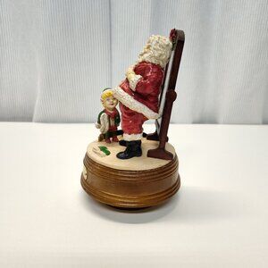 This charming 1991 House of Lloyd wind-up musical figurine showcases Santa and his helpers in a delightful, heartwarming scene. Aptly titled "A Tight Fit," it plays "Deck the Halls" while spinning, embodying the joy and whimsy of the holiday season. A perfect collectible for those who appreciate intricate details and festive cheer.