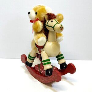 This vintage 1989 House of Lloyd musical rocking horse with a plush bear plays "Santa Claus Is Coming To Town." A nostalgic holiday accent.