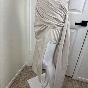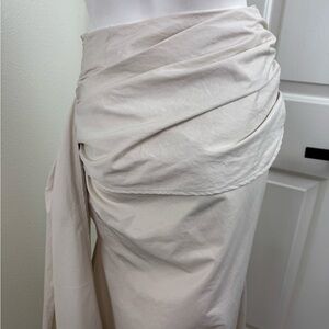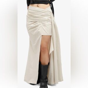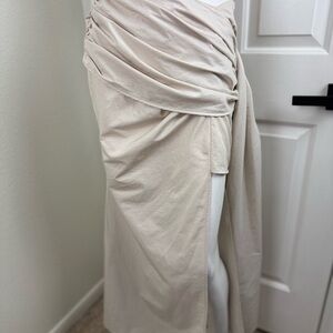 Elevate your evening ensemble with this stunning cream maxi skirt from House of Sunny. Designed with a chic wrap style, it features elegant ruched detailing and a daring side slit, perfect for cocktail parties or a night out. The flowing silhouette and sophisticated draping add a touch of modern elegance to your wardrobe this skirt is in good condition.