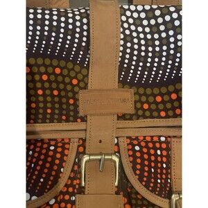 This is a perfect bag for a extra long weekend. Referred to as a sackpack because it big like a sack. measuring width is 20 inches. It is 20 inches tall but when folded and buckled it is 15 inches. depth is 7 inches. This bag has multiple functions with luxury leather adjustable back straps, adjustable top closure on the very top and also folded front closure is adjustable strap. two large front deep pockets with adjustable leather straps. There are side zips on each side allowing you to reach into side of backpack without unbuckling the leather strap. These are two separate pockets. This bag is 100% handcrafted by a local artesians in Kenya, East Africa. Please refer to last picture as to how large this bag is. Brand new without tags. Comes from a smoke free home. Retail cost $320. These bags are very rare and hard to fine .