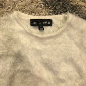 House Of Three White Fuzzy Short Sleeve Sweater. Size 8. 100% acrylic. Ribbed hemline and sleeve openings. Crewneck. Perfect condition.