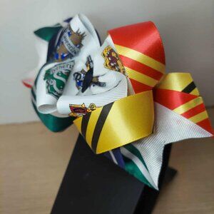 alling all witches and wizards! Show off your Hogwarts house pride with this colorful, handcrafted bow featuring all four iconic houses—Gryffindor, Slytherin, Ravenclaw, and Hufflepuff. Whether you're a brave lion, clever eagle, loyal badger, or cunning serpent, this bow unites the magic!