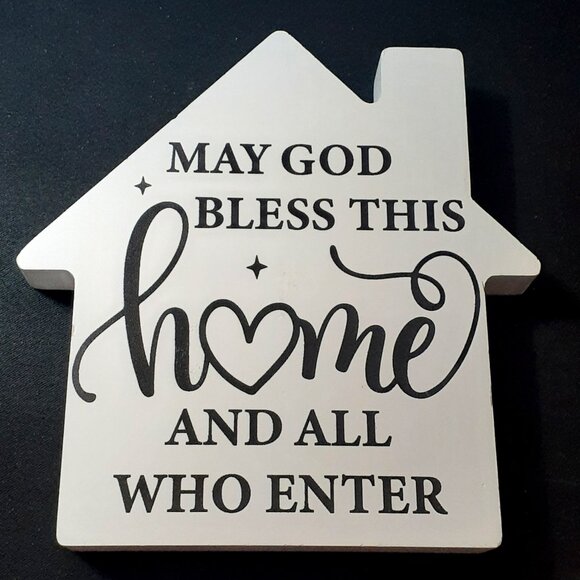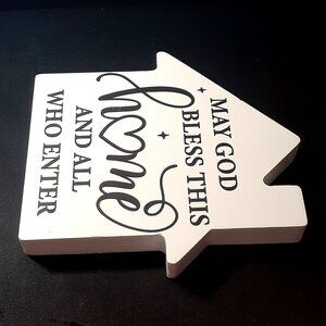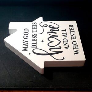 It features a modern design with a white and black painted finish and contains a quote that reads "May God Bless This Home and All Who Enter."