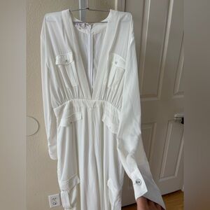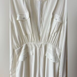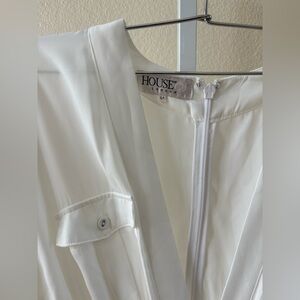 House of CB Adabelle Jumpsuit in White - Size L+ Condition: Excellent PTP: 23” laying flat Waist: 16.5” Inseam: 32” Shoulder to Hem: 62.5” Measurements are approximate. 'Adabelle' is cut from a flowing georgette and has a single layer to the top, double to the trousers, resulting in a wonderful semi sheer Summer feel. The deep plunge neckline looks great with a crisp white bikini top under and we love the versatility of this beach to bar piece. Made from semi sheer georgette. True to size per brand website. Stretch Factor: 1/3 Length: Approx 156cm Inside Seam Length of Trousers: Approx 84cm Materials: Georgette (100% Polyester) Gentle Dry Clean Only All items from my closet are final sale.