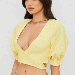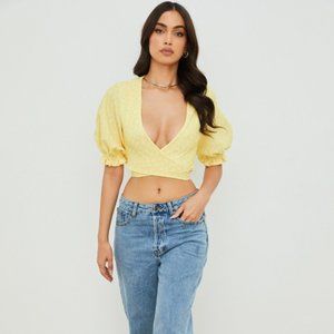 'Alanya' is designed to be worn either as a wrap front or tie front top. It's made from a lightweight crepe and dotted with pretty floral blooms in a fresh yellow colour. 'Alanya' has a plunging neckline with a cropped hem that loosely ties at the front or can be wrapped across the bust and tied at the back. Wear yours with your favourite jeans like our 'Yara' Vintage Fit High Waist Jeans.