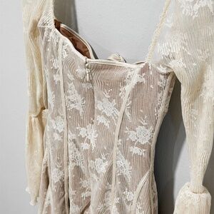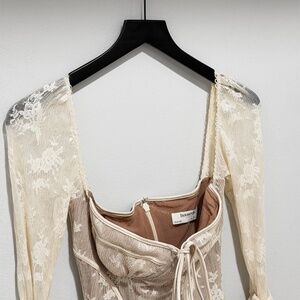 Stunning House of CB dotted lace mini dress in a soft cream shade. Made from pleated dotted lace with satin trims and a power mesh lining that smooths and shapes. It has a sweetheart neckline, relaxed underwired cups, light boning at the waist, and long sleeves with pleated cuffs that match the floaty hem.