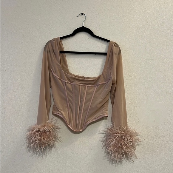 This elegant beige corset top features unique feather cuffs for a stylish touch. Perfect for a night out or special occasion.