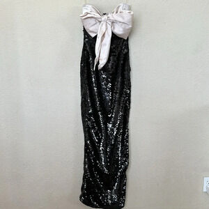 Elegant black sequin maxi dress. Strapless design with a large cream bow accent. Perfect for evening events.
