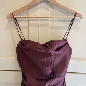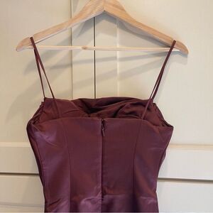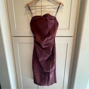Elegant burgundy midi dress. Features a draped neckline and fitted silhouette. Perfect for evening wear.