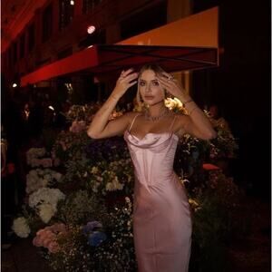 House of CB Charmaine Maxi Dress in Blush Pink. Size Large. Features draped cowl neckline, corsetry boning to cinch the figure in, cups are softly lined and underwired for full support and uplift, and adjustable shoulder straps. NWT / New with tags.