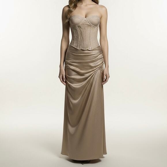 NWT House of CB London two-piece formal gown bundle featuring the Demi Corset and Jia Maxi Skirt in a stunning gray/silver/pewter satin. Both pieces are handcrafted, sustainably sourced, and known for their sculpted, couture-level fit.