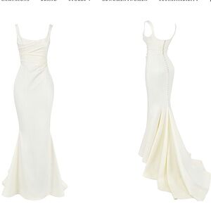 Stunning white wedding dress by House of CB. Features a fitted silhouette and elegant train. Perfect for a sophisticated bridal look.