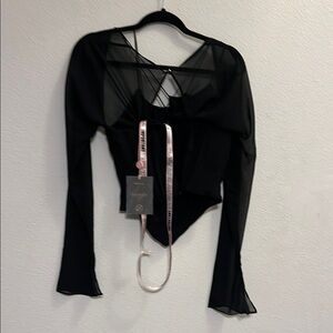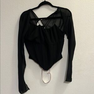 This elegant black top features a sheer design with long sleeves, perfect for a night out. Its stylish cut adds a touch of sophistication to any outfit.