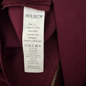 The House of CB London "Anelle" Wine Red Bandage Dress in size Large is a luxurious and stylish option for formal occasions, weddings, or parties. This sleeveless dress features an off-the-shoulder neckline, zip closure, and a pleated accent. Made from 100% polyester with a satin fabric type, this midi dress has a bodycon style with a side slit and corset details. The wine red color adds a touch of elegance, perfect for any season.
