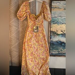 House of CB Maxi Dress Sz XS Yellow Floral Felizia Butter Print Puff Selene NEW