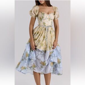 House of CB Penelope Floral Puff Sleeve Corset Chiffon Midi Dress