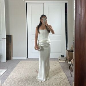 Super flattering and chic House of CB ivory strapless corset dress with elegant draping. Ideal for special events.