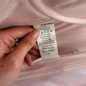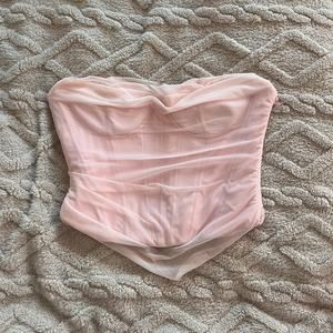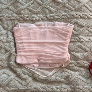 Elegant strapless top. Soft pink hue. Ruched detailing. Perfect for chic occasions.