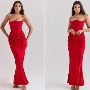 Elegant red maxi dress. Strapless design. Fitted bodice with draped skirt.